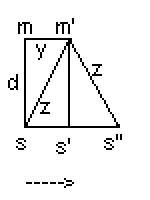 The journey from S to M' is similar to the return from M' to S", also of distance, z. Therefore, the total distance traveled by a crossing light-speed "boat" is twice z, or,